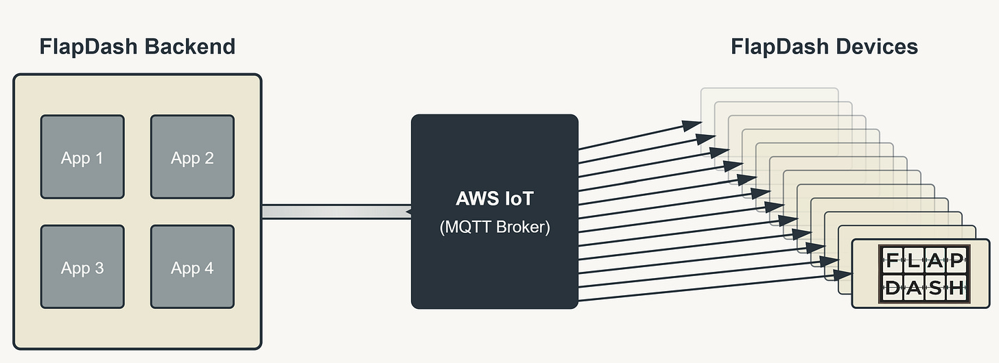 It’s really quite fancy. Whenever you get a new FlapDash device and connect to the internet for the first time, it’ll register on our backend and be issued a X.509 certificate. Those certificates will allow it to connect to our MQTT broker, which is AWS, and subscribe to two, custom, just-for-you feeds: device/{device_id}/{control, display}, as well as a number of custom feeds.